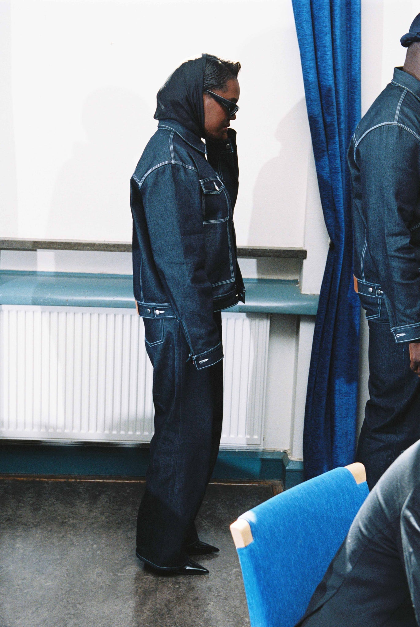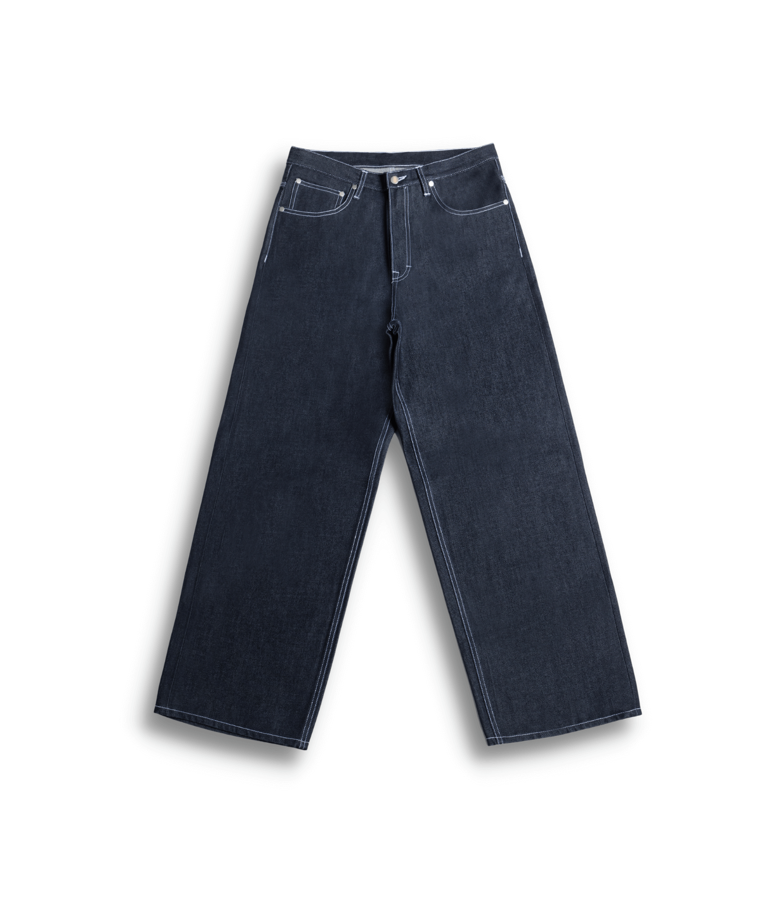 A pair of unisex jeans raw denim jeans with a loose and oversized fit. The indigo-colored jeans feature five pockets. Indigo color. All Benim Denim products are made with Circulose® recycled from post-consumer denim. Made in Malmö, Sweden.